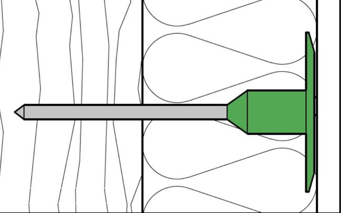 Steifer Dämmstoff-Tellerbefestiger mit versenkter Stahlschraube und Dämmpfropfen für die oberflächenbündige Befestigung der STEICO protect Holzfaser-Dämmplatte auf einer tragenden Holzkonstruktion.