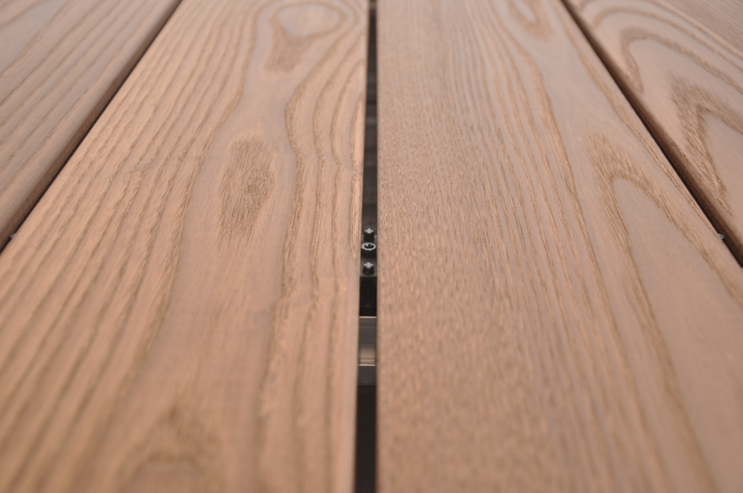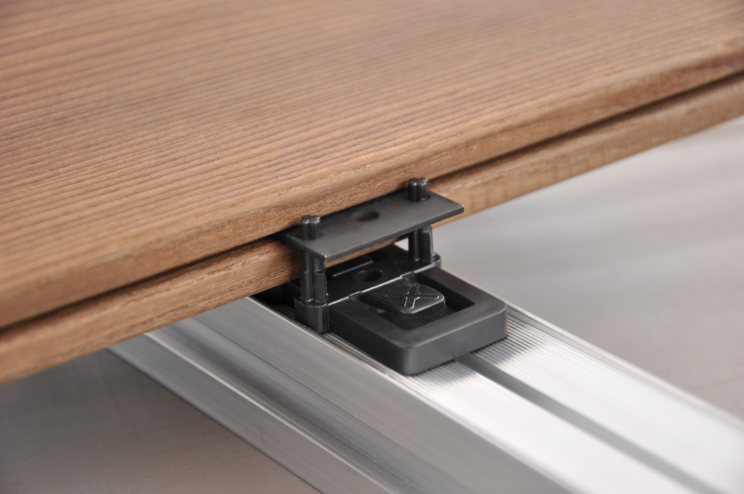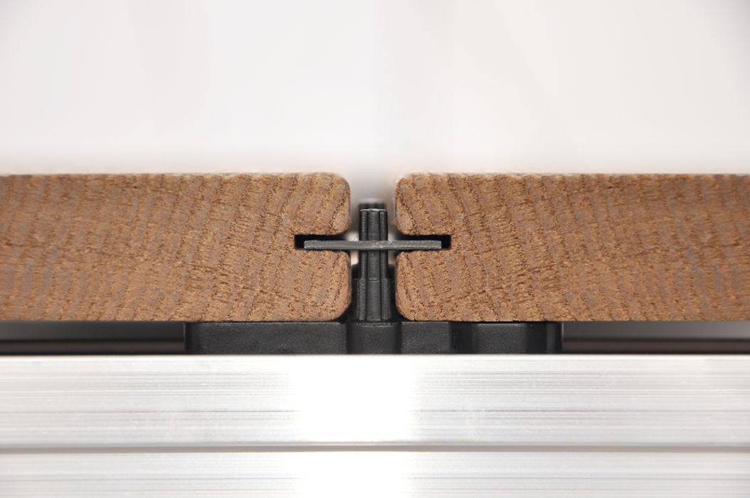 Das patentierte Terrassen-Verbindersystem LIGO garantiert eine einfache und schnelle Montage von seitlich genuteten Terrassendielen aus Holz oder holzähnlichen Werkstoffen.