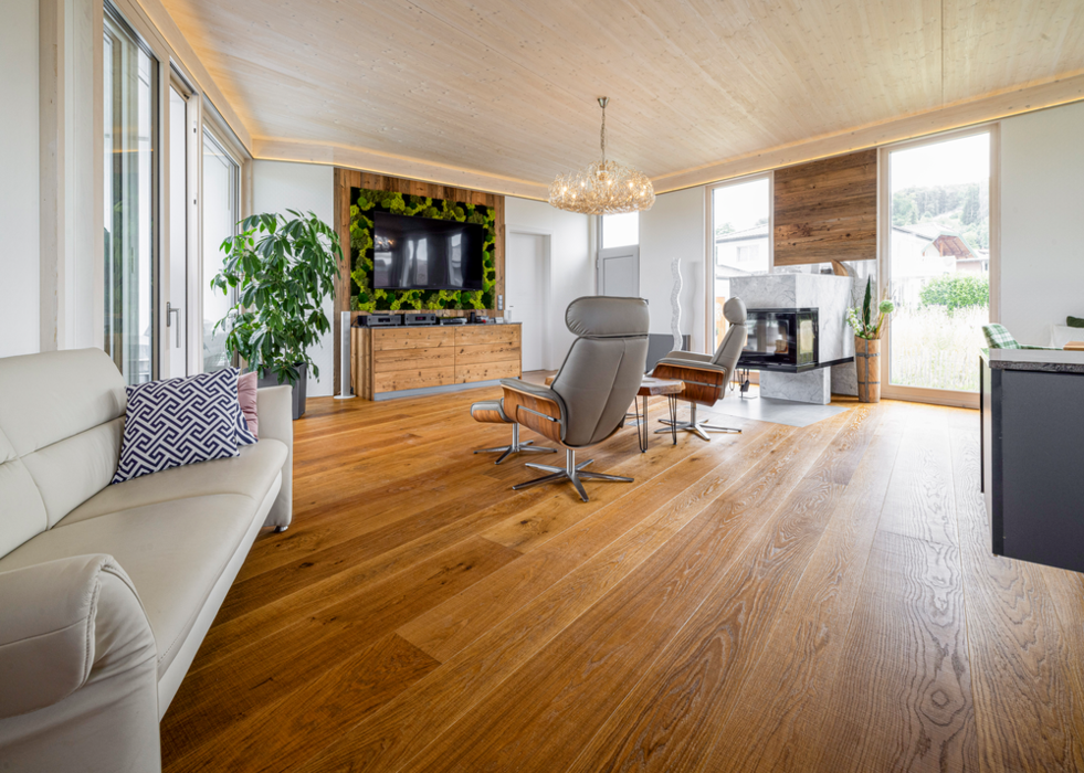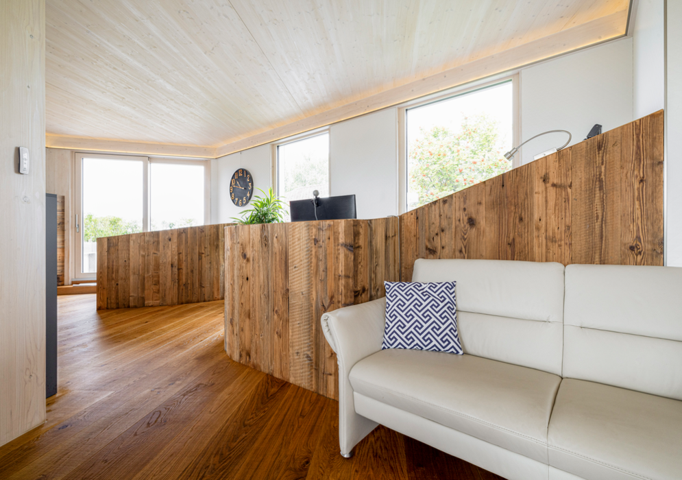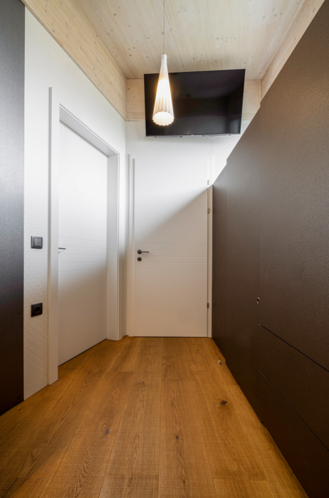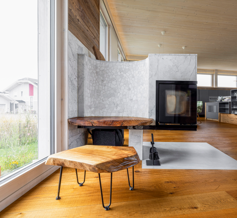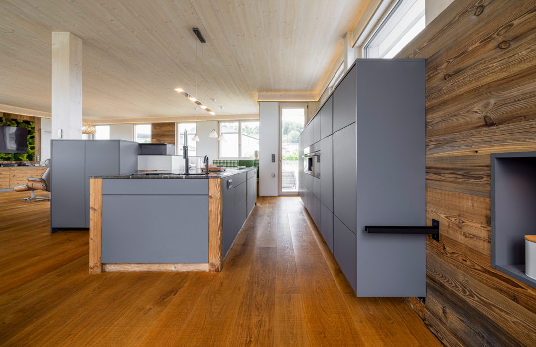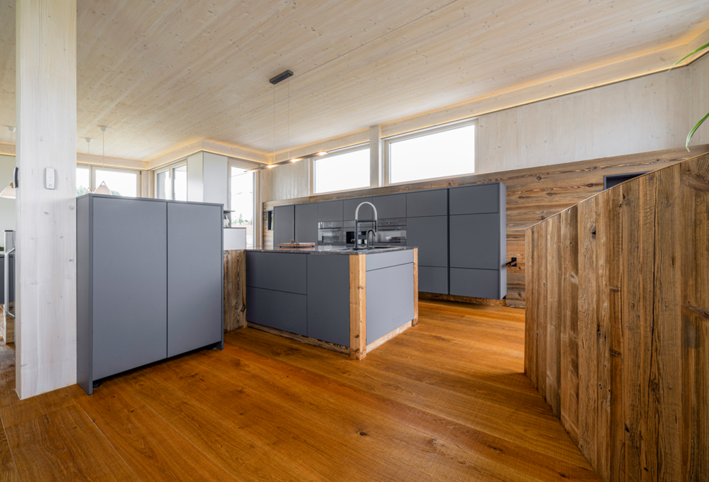 Vom Wohnzimmer- über den Ess- und Eingangsbereich bis hin zum Badezimmer: Holz ist tonangebendes Material, das an klug gewählten Orten weiteren Materialien Raum lässt, um ansprechende Kontraste zu schaffen. Weiß lasierte Massivholzdecken sowie gebürsteter und geölter Eichenparkett geben den Rahmen vor. Ein besonders ansprechendes Designelement im Essbereich stellt ein Ecktisch aus einer Baumtischplatte aus Schwarznuss dar. Auch ein Beistelltisch und eine Ofenbank wurden aus dem besonders hochwertigen Material gefertigt. Im Badezimmer sorgt oberhalb der Fliesen eine weiß lasierte Wandverkleidung aus gehackter Eiche mit Nut und Feder für ein angenehmes Raumklima. Die Decke aus schwarz lasiertem Massivholz verleiht dem Raum eine moderne Note, die gekonnt um Möbelfronten und Rahmen aus achatgrauen Optimatt Dekorspanplatten von Kaindl ergänzt werden. Die Sauna aus Abachi Profilholzlatten laden zum warmen entspannen ein.