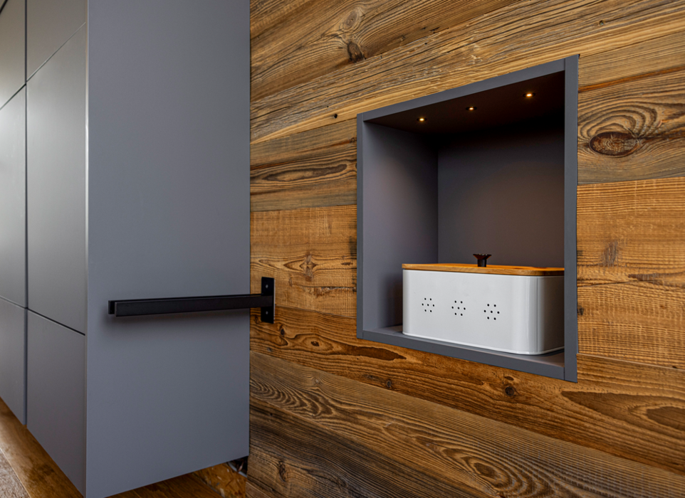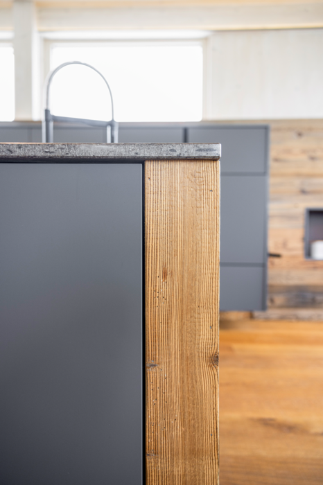 Bereits der Zugang zum Loft ist ein Erlebnis, denn er erfolgt nicht konventionell über eine Treppe, sondern über einen Lift, der mit Dekoren von Cleaf sowie mit Sperrplatten verkleidet wurde. Ansprechende Oberflächen von Cleaf finden sich auch als Wandverkleidung und Schiebtürschrank im Kleiderraum. Oben angekommen wartet mit der Küche schon das nächste Highlight des Raumes. Materialien aus Holz – wie Wandverkleidung aus sonnenverbranntem Altholz oder Massivholzplatten aus Fichte – werden ergänzt um Fronten und Rahmen aus Dekorspanplatten Optimatt in graphitgrau von Kaindl. Eine Kompakt Arbeitsplatte in Betongrau von EGGER und eine Arbeitsplatte in Granitstein komplettieren die Küche.