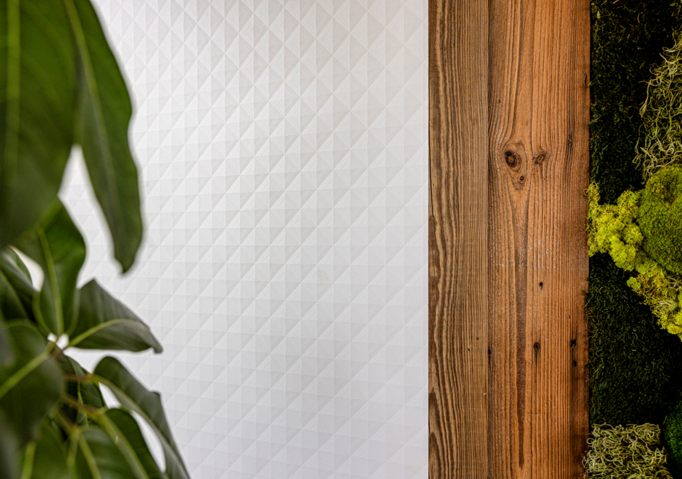 Wandverkleidung: Sperrplatte Saunaply-Altholz; Dekorspanplatte Cleaf Cheope total white
