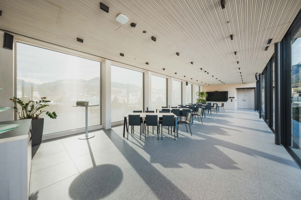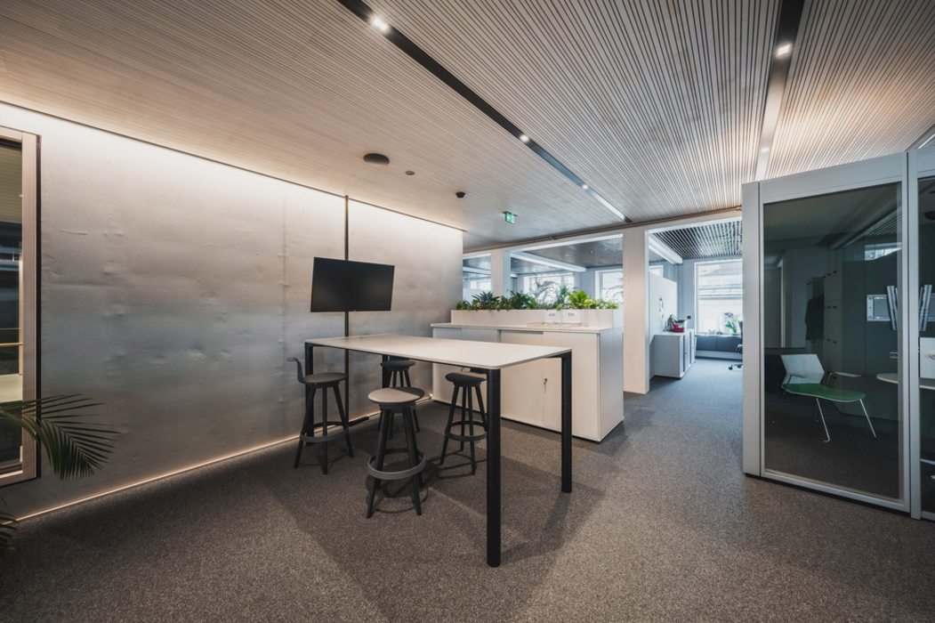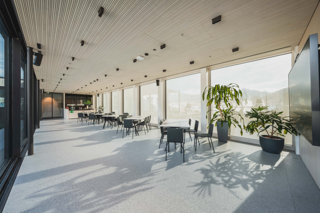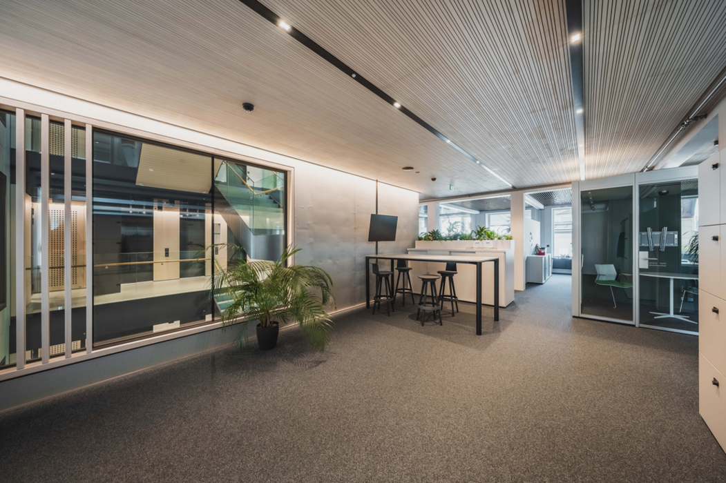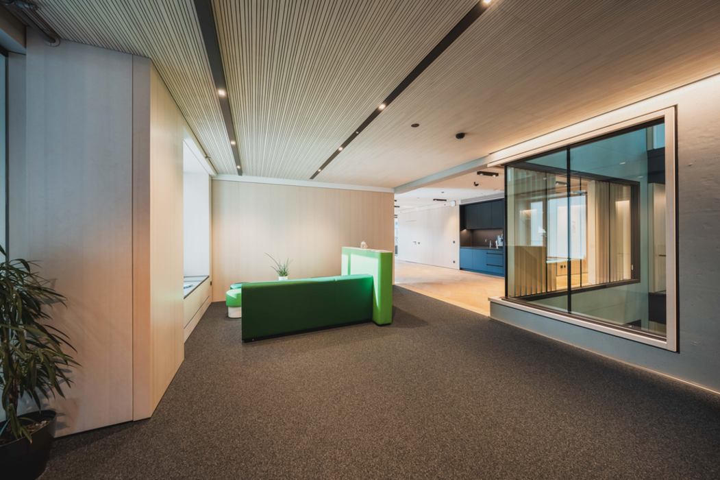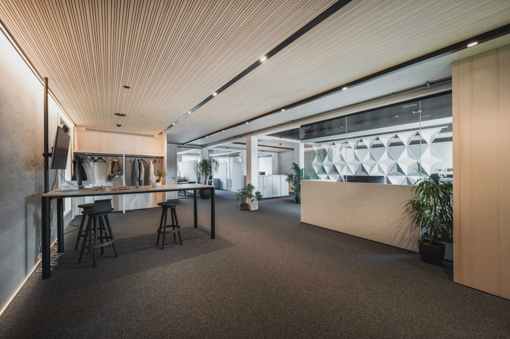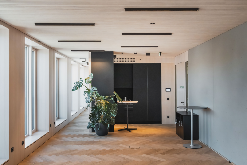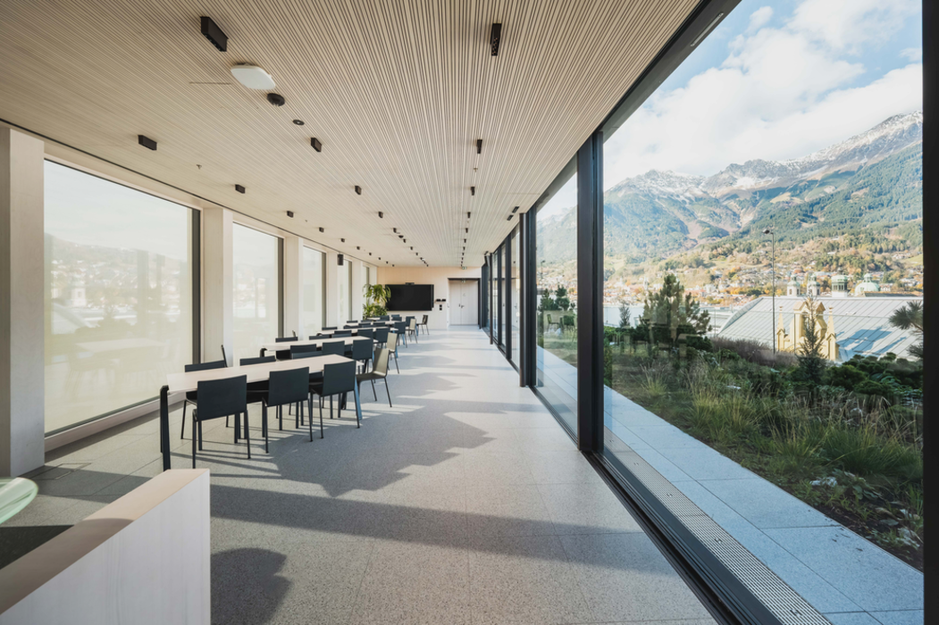Die durchgehenden Holzdecken führen die Räume zusammen und wirken wie ein atmosphärischer Leitfaden durchs Gebäude. Im Empfang unterstreicht die gleichmäßige Deckengestaltung den warmen, klaren Charakter des Hauses. Er biete damit einen Ruhigen Ort des Ankommens. In den Obergeschossen unterstützt sie unterschiedlichste Nutzungsszenarien – vom offenen Büro bis zur Cafeteria mit Blick auf die Nordkette. Das ausgewählte Akustik-Element Novatop Acoustic Marilyne wirkt dabei warm und leicht – und bildet ein bewusst ruhiges Gegengewicht zu Glas, Metall und den offenen Arbeitskonzepten.