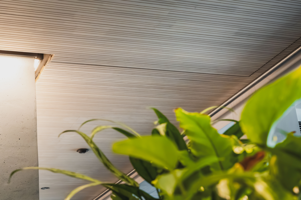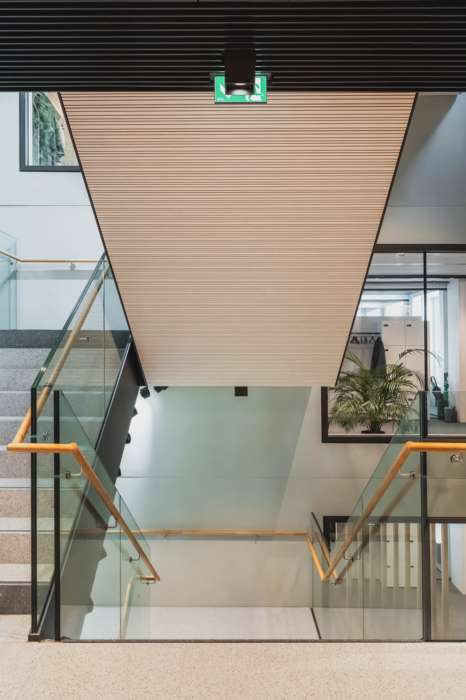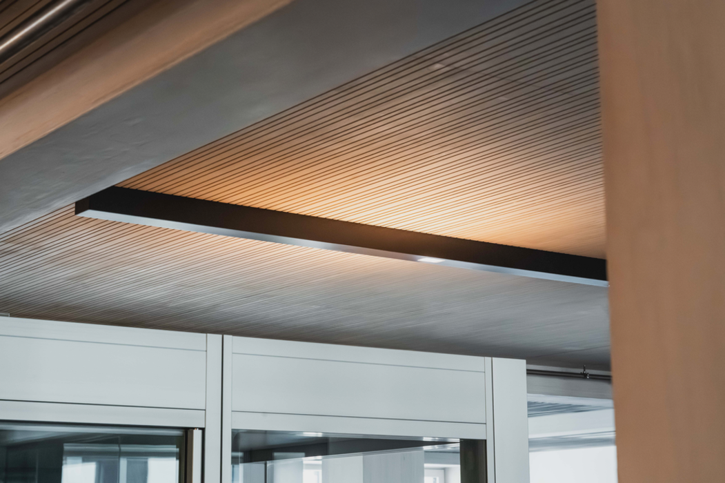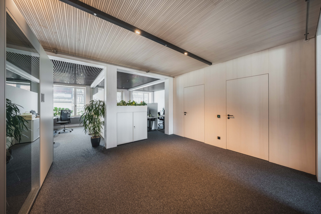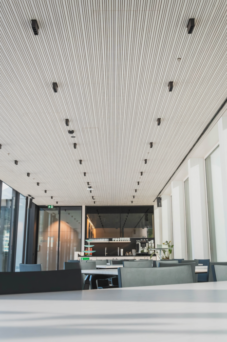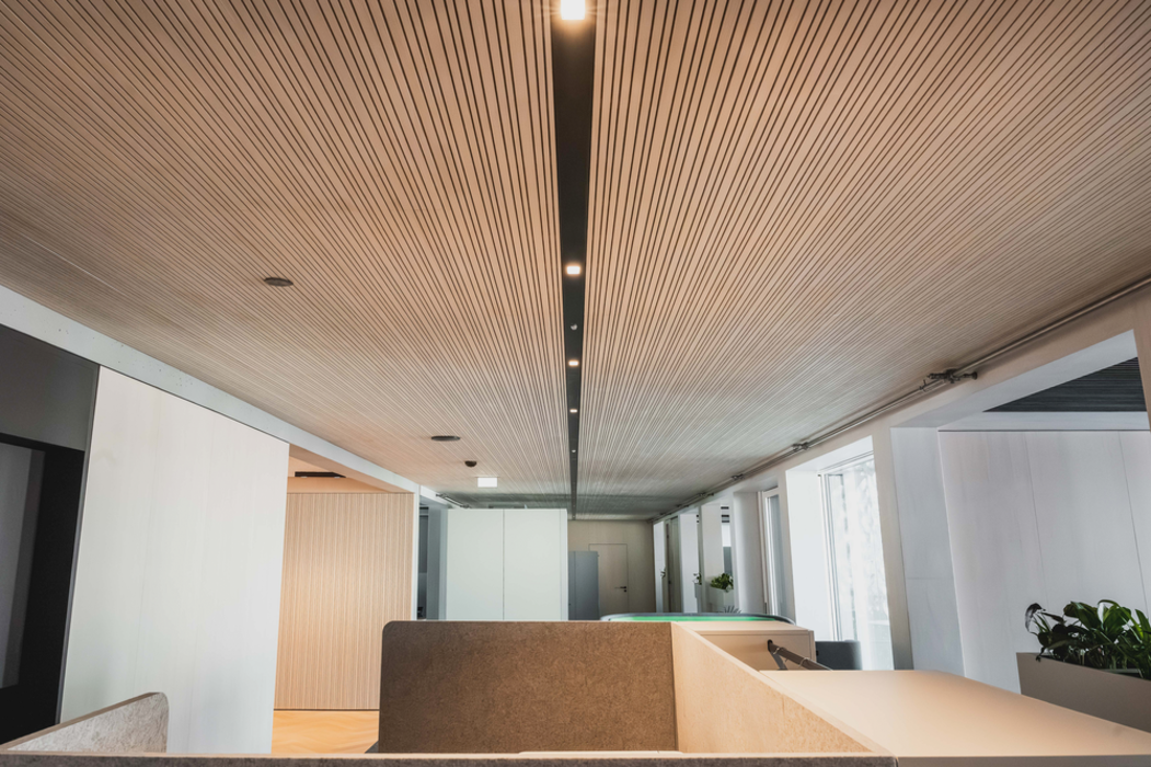 Der Neubau ersetzt den früheren Standort und öffnet sich mit großen Glasflächen, klaren Linien und einem zurückhaltenden Farbkonzept zur Stadt. Große Glasflächen, helle Flächen und feine Strukturen bilden ein ruhiges Gesamtbild. Die Decken aus Novatop Acoustic Marilyne S1 in Weißtanne inklusive STEICOtherm SD 20 mm – ausgeführt in der finalen Behandlung Zugspitze – führen die Räume optisch zusammen und verleihen ihnen eine leichte, präzise Textur. Das ausgewählte Akustik-Element überzeugt durch seine lineare Schlitzung und seine ruhige Oberflächenwirkung. Der Deckenaufbau wurde um die Holzdämmung Steicoflex 036 ergänzt. Dabei handelt es um eine Holzfaserdämmplatte, die als zusätzlicher Absorber hinter den perforierten Paneelen wirkt.