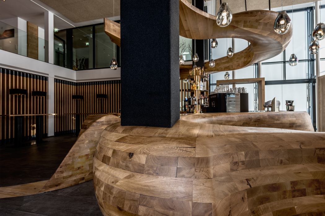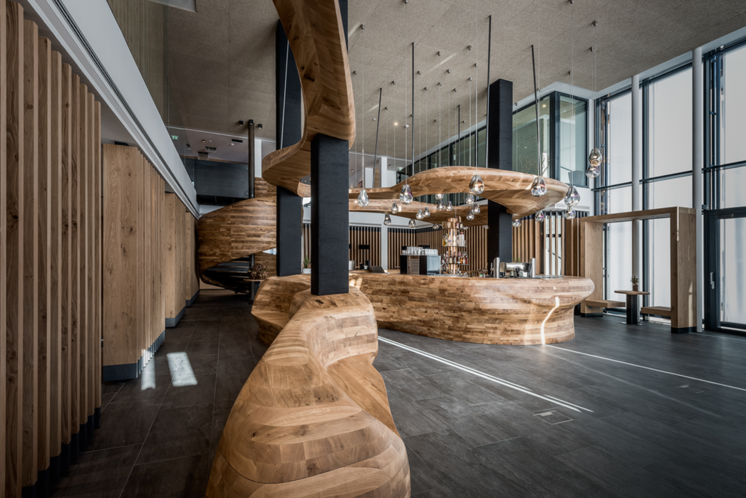 Unter dem klingenden Namen FREIRAUM wurde im Leoganger Hotel Puradies ein innenarchitektonisches Meisterstück geschaffen, das selbst im Bereich internationaler Designhotels neue Maßstäbe erreicht. Aus 16 000 Eichenholzwürfeln, geliefert von JAF Kramsach, entstand ein durchgehendes Raumelement das Lounge, Bar, Kunstobjekt und Wendeltreppe vereint.