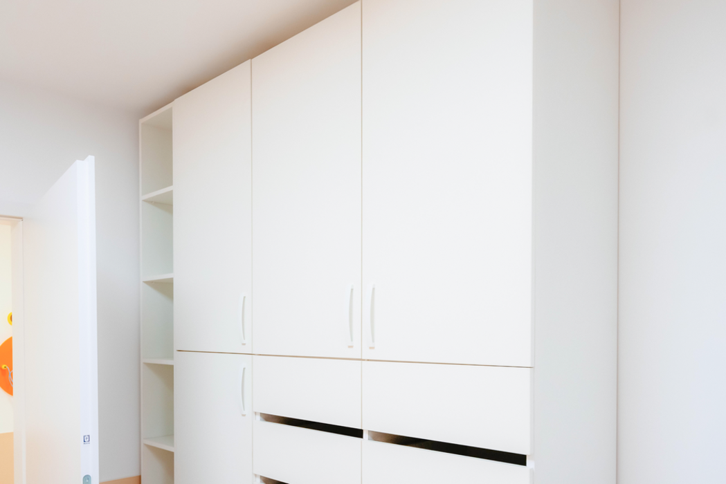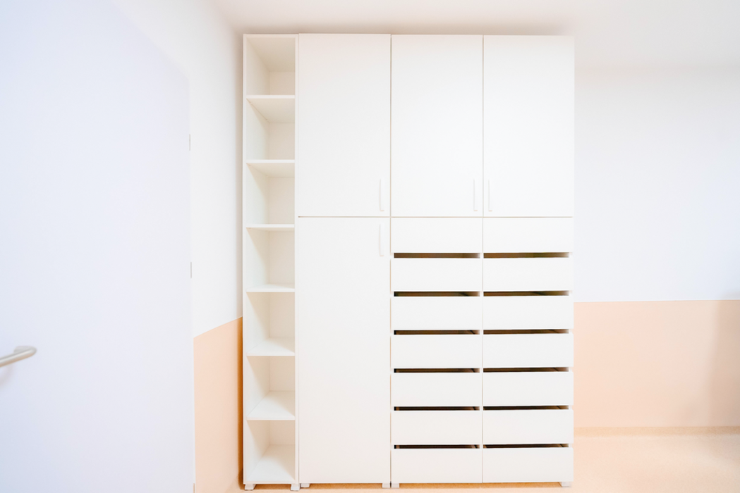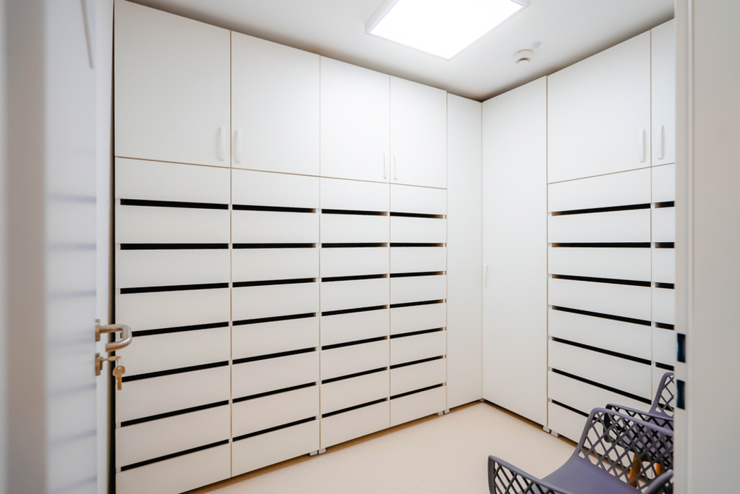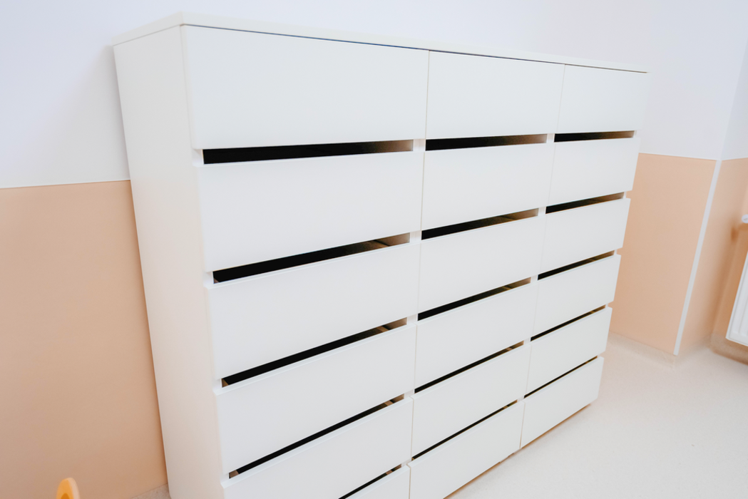 Ergänzt wird das Konzept durch Holzdekore wie Egger H1145 ST10 sowie helle, reduzierte Flächen in Egger W1000 ST19. Diese Kombination verbindet natürliche Anmutung mit hoher Pflegeleichtigkeit. Die sorgfältig abgestimmten Oberflächen erzeugen ein ausgewogenes Farb- und Materialbild, das Ruhe ausstrahlt und gleichzeitig eine freundliche, kindgerechte Umgebung schafft. ABS-Kanten sorgen dabei für Langlebigkeit und schützen die Möbel im intensiven Alltag eines Gesundheitsbetriebs.