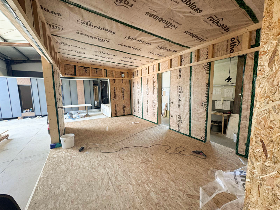 Die Fassaden prägen Thermo-Kieferprofile in den Varianten Paralelogram SSS und SHP. Ihre gleichmäßige, warme Farbgebung fügt sich harmonisch in die Landschaft ein, während die thermische Modifikation für hohe Formstabilität sowie Widerstandsfähigkeit gegenüber Feuchtigkeit und anderen Einflüssen sorgt. Ergänzt wird die Konstruktion um Nordic Pine Thermo AB SHP, die zusätzliche strukturelle Stabilität und langfristige Verlässlichkeit gewährleistet.