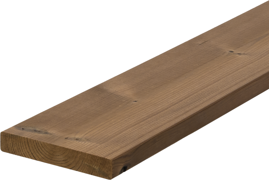 Thermo-Kiefer bewahrt sich die lebendige, kontrastreiche Zeichnung der Rohware sowie deren deutliche Jahresringstruktur. Die thermische Modifizierung bringt Formstabilität und Dauerhaftigkeit für einen langfristigen Einsatz im Freien. Die Kiefer nimmt zudem einen warmen Karamell-Farbton an, der sich unter Einfluss von Licht und Wetter in ein edles Silbergrau verwandelt. Regelmäßig mit pigmentiertem Öl behandelt, behält es seine wunderschöne, mittelbraune Farbe.