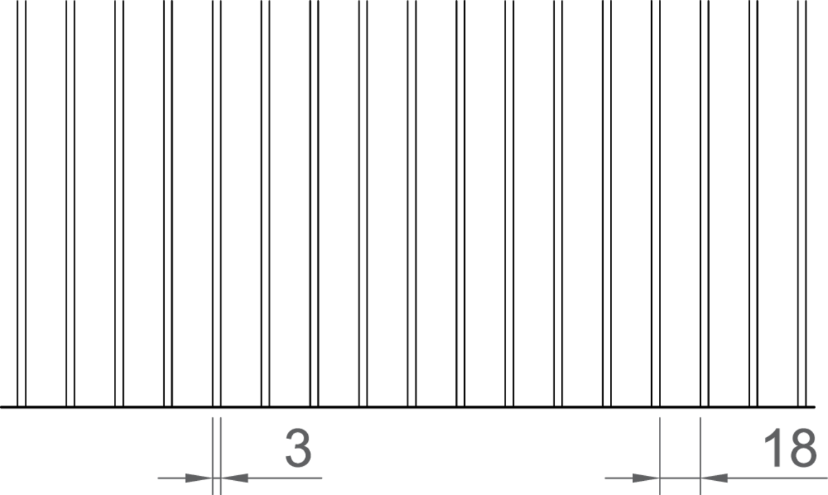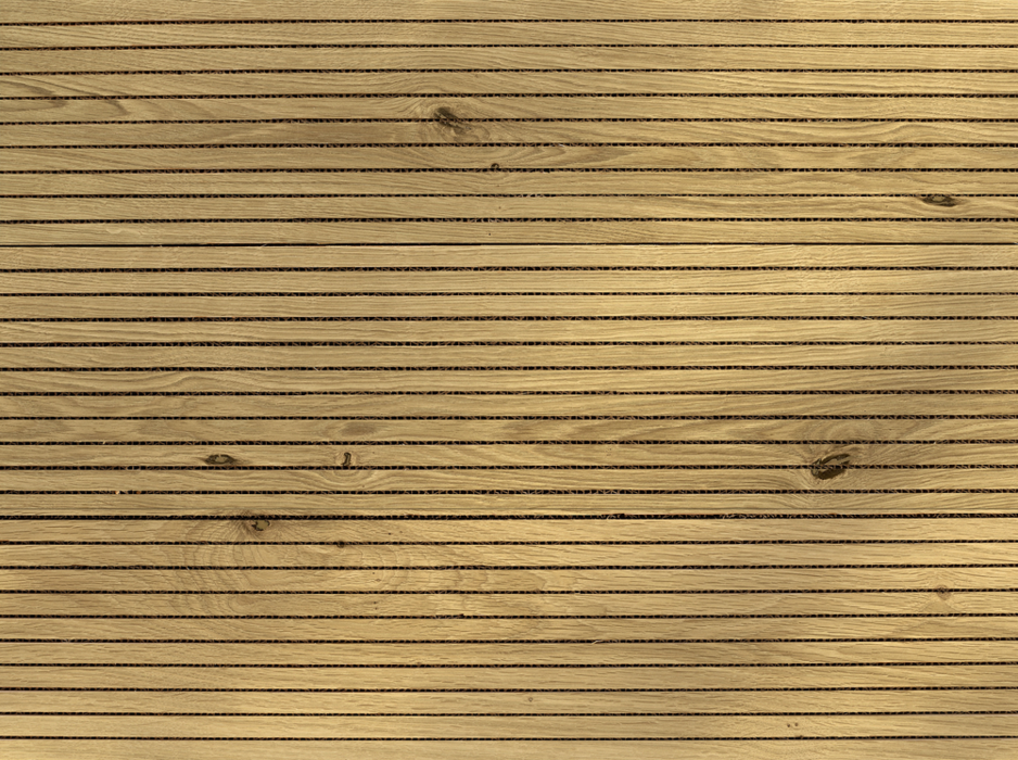 Massivholz Decklage (Schnittgeometrie: 15 mm Steg - 3 mm Schlitz) 30 mm Sinuswabe, Rückseitig aufkaschiertes Akustikvlies. Verdeckte, werkzeuglose Montage mittels ACOUSTICs Befestigungssystem oder Direktbefestigung mit Klammern oder gestauchten Nägeln durch die MDF-Feder. Details siehe Montageanleitung.