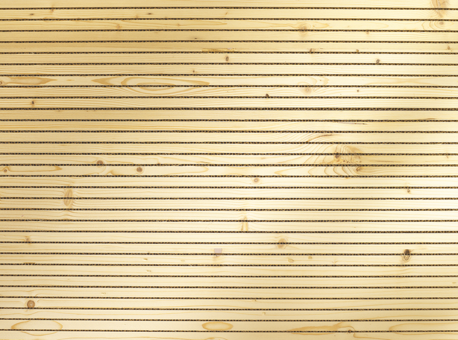 Massivholz Decklage (Schnittgeometrie: 15 mm Steg - 3 mm Schlitz) 30 mm Sinuswabe, Rückseitig aufkaschiertes Akustikvlies. Verdeckte, werkzeuglose Montage mittels ACOUSTICs Befestigungssystem oder Direktbefestigung mit Klammern oder gestauchten Nägeln durch die MDF-Feder. Details siehe Montageanleitung.
