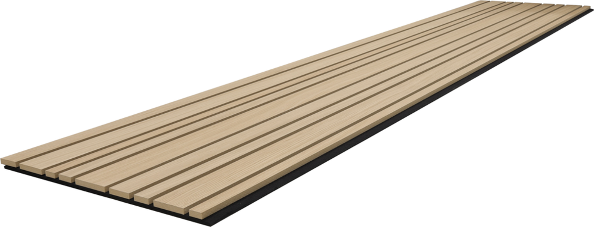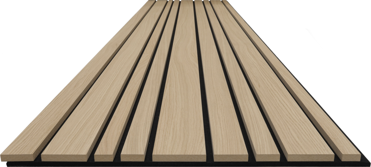 Die Akustik-Designpaneele bestehen aus einem Träger aus PET-Vlies mit echtfolzfurnierten MDF Lamellen. Die Oberfläche ist mit Hartwachs behandelt, wodurch das Holz optimal geschützt ist. Die Kanten sind leicht gefast. An der Rückseite der MDF Lamellen befindet sich ein Gegenzugpapier, das ein Verziehen der Lamellen verhindert.