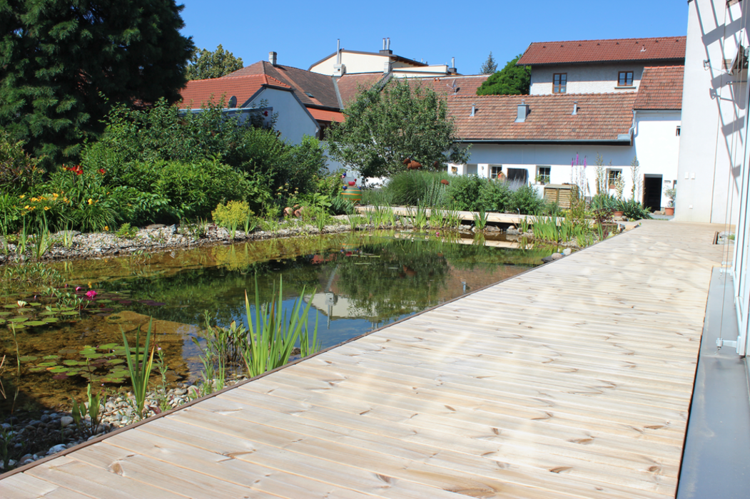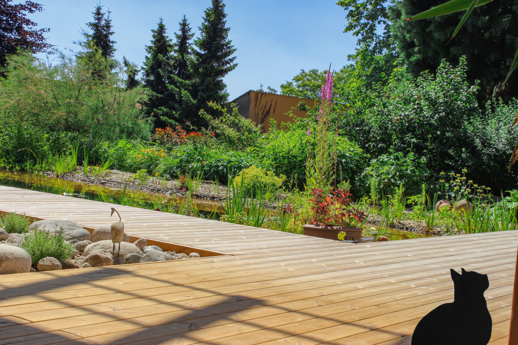Thermo-Kiefer bewahrt sich die lebendige, kontrastreiche Zeichnung der Rohware sowie deren deutliche Jahresringstruktur. Eine Terrasse aus Thermo-Kiefer vermittelt moderne Bodenständigkeit sowie ein behagliches Ambiente.