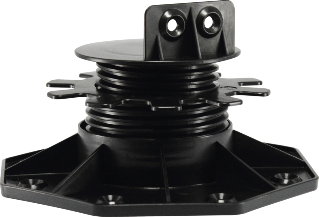 Mit diesem Stellfuß wird durch einfaches Links-/Rechtsdrehen stufenlos das Höhenniveau verstellt. Die Verstellung ist auch unter Last, also in eingebautem Zustand, möglich. Pro m² werden ca. 5 Stellfüße benötigt. Das Belastbarkeitsmaximum liegt bei ca. 3,15 Tonnen. Die Stellfüße sind UV-stabil.