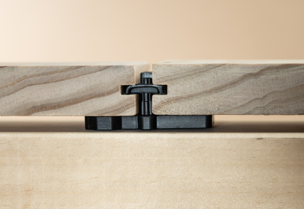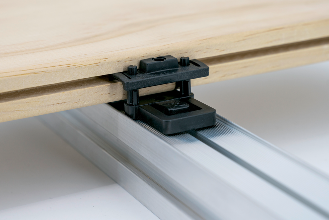 Das patentierte Terrassen-Verbindersystem LIGO garantiert eine einfache und schnelle Montage von seitlich genuteten Terrassendielen aus Holz oder holzähnlichen Werkstoffen.